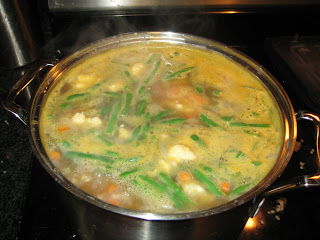 After 10 minutes of sauteing I added vegetable broth, potatoes and carrots; bring to a boil. Lower heat; add cooked barley, green beans, cauliflower and bay leaves. I then added the spices and let it cook.