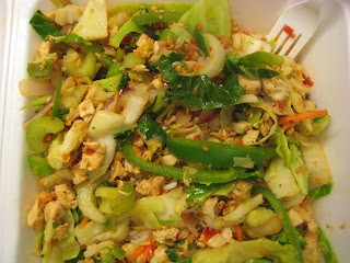 Lunch was so satisfying. I had Mongolian stir fry which consisted of carrots, cabbage, celery, green peppers, lettuce leaves, onions, broccoli and chicken with a spicy chili sauce. All of these wonderful veggies were placed on top of half cup white rice. Nothing bad to say about this dish, pretty healthy and I got some protein.