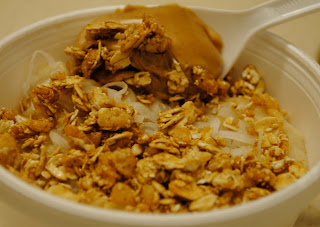 I froze my tush off while waiting for the bus this morning. Once I got to work I got some hot oatmeal to warm me up. I topped my oats with granola, coconut and peanut butter. Wasn’t very hungry so I only ate half of it.