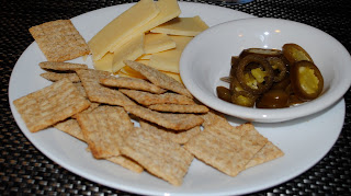 KerryGold Aged Cheddar, Roasted Garlic Triscuits and Vlasic Hot Jalapeno Slices. We stack all 3 ingredients, put them in our mouths and chew. So good!