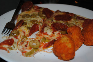 I had thin crust cheese pizza with peperoni and green olives and a couple buffalo chicken bites: