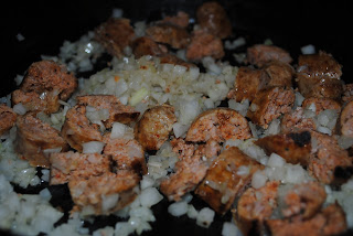 I cute up the sausage into little pieces and placed them in a cast-iron skillet alone with the onions. This is where you can add salt and pepper.