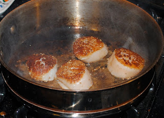 Heat up olive oil in skillet. Once heated swirl olive oil in pan and add seasoned scallops. Let scallops brown on first side, flip, count to about 30, and place on plate.