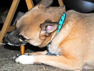 Here is the birthday boy chewing on his birthday treat, a bully stick! He thinks it is the best treat EVER!
