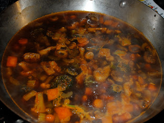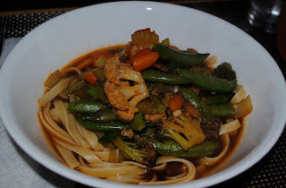 4. While the veggies are cooking, cook fettuccine in separate pan according to package directions. Place serving of fettuccine in bowl and top with the hot broth and vegetables.