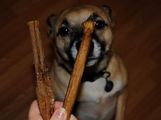 Wait, he didn’t just bring me a snack. He also brought our dogs their very favorite treat, bully sticks. Solera just couldn’t wait to get his teeth wrapped around one of these:) This picture cracks me up!