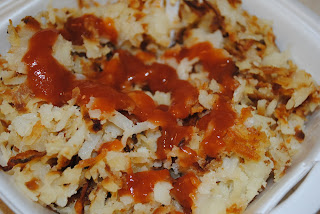 Hash browns with hot sauce.