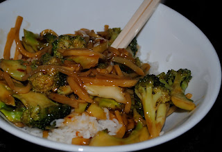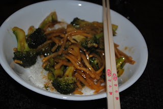 Chinese food which contained broccoli, bamboo shoots and white rice:
