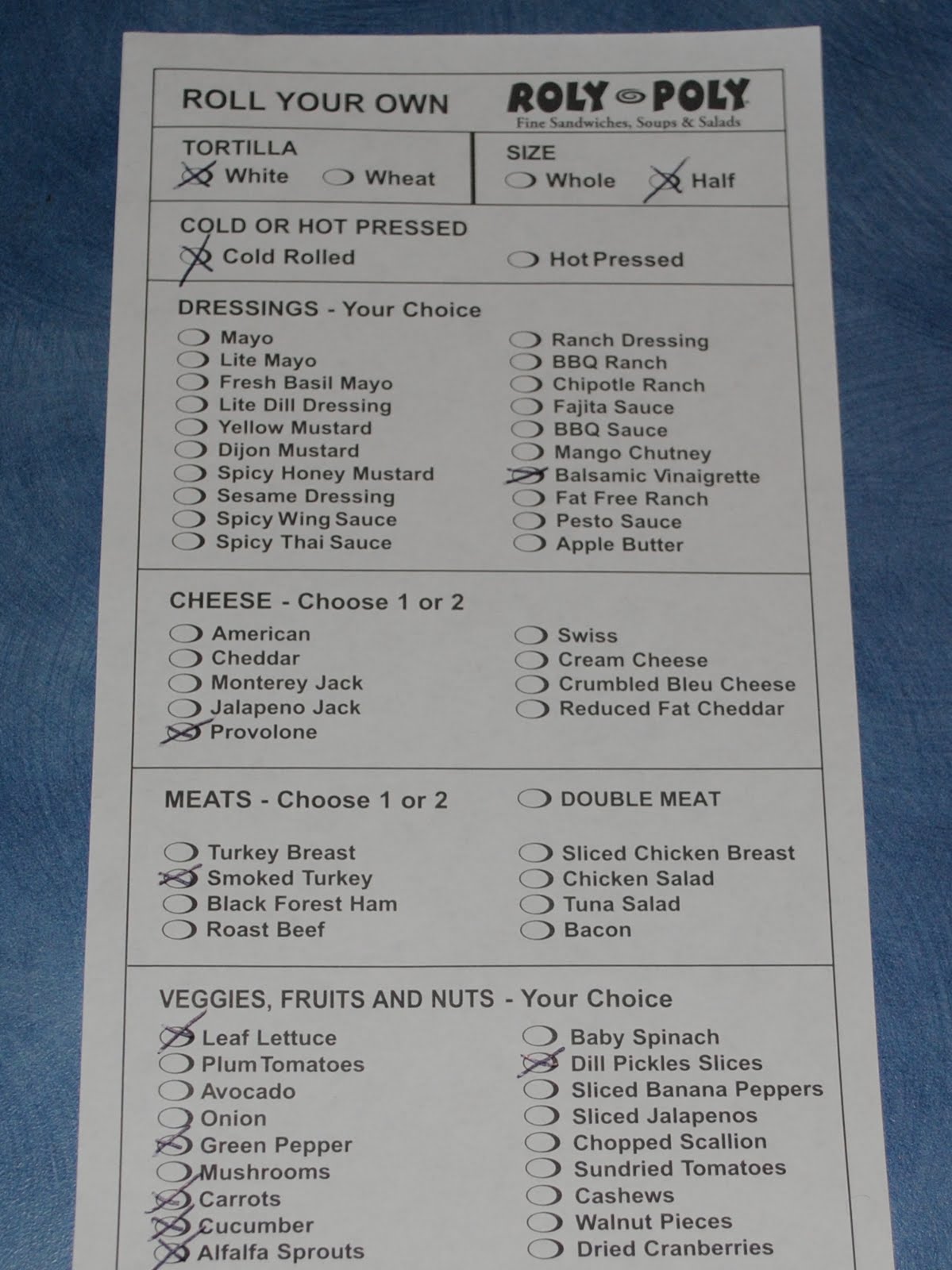 They have many options for hot or cold rolled sandwiches. I opted for the Roll Your Own option. I filled out the form to let the kitchen know how I would like my sandwich:
