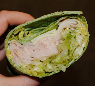 The main dish was turkey, spicy mustard, lettuce and cheese wrapped in a spinach wrap: