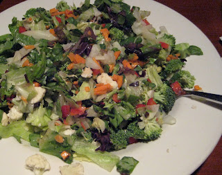Loaded Veggie Salad: broccoli, carrots, pea pod, cucumber, celery, cauliflower, red pepper, mixed greens with a raspberry vinaigrette