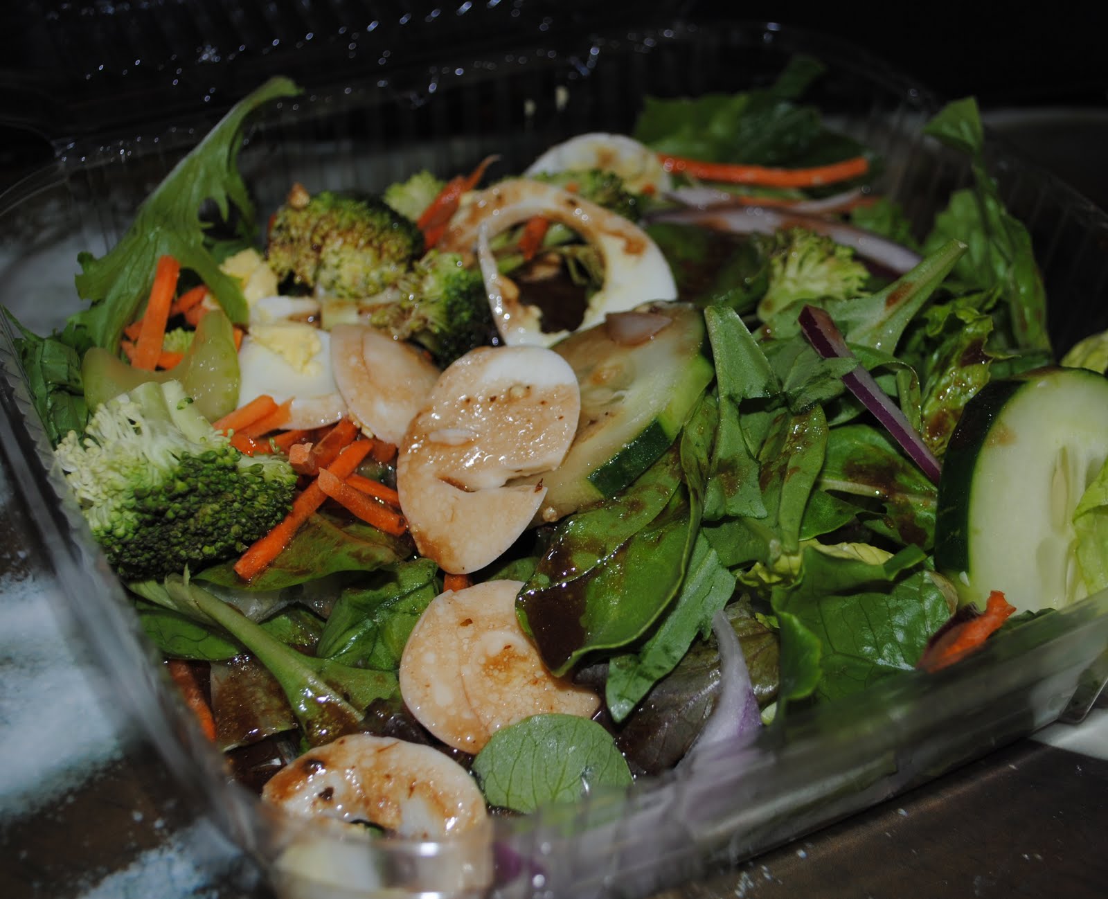 Romaine, mixed greens, broccoli, carrots, egg, cucumber, celery, red onion and topped with balsamic: