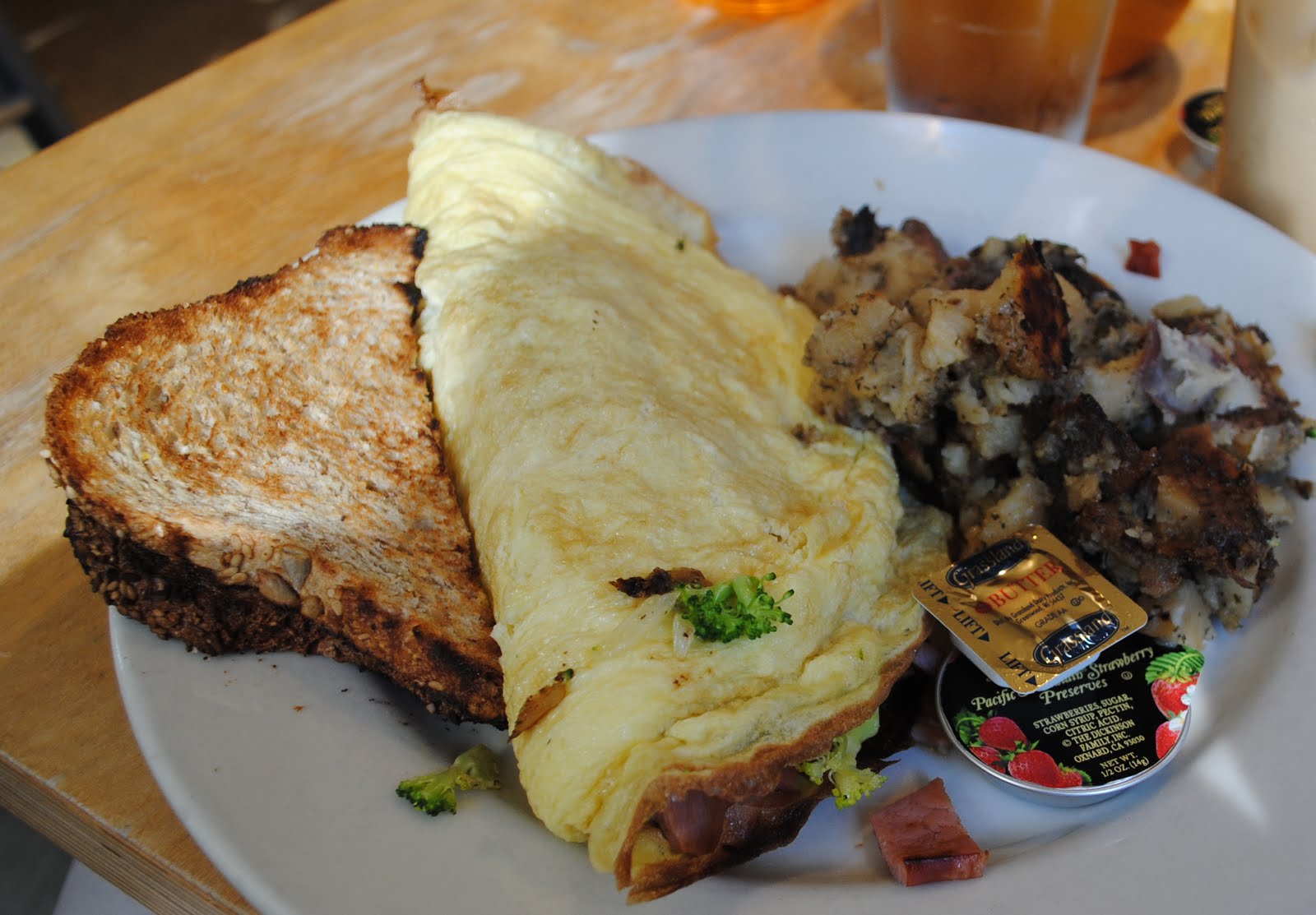 My main dish was an omelet with broccoli, Canadian bacon and smoked aged white cheddar. Very good, I was shocked at how good the broccoli tasted in the omelet. The sides were multi-grain toast and potatoes. However, I did not eat the potatoes because they tasted strange to me.