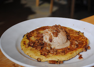 My breakfast appetizer (I’m allowed an appetizer, it was a celebration) was 1 Pumpkin Spice Pancake topped with browned butter & dark brown sugar cream mouse topped with sweetened glazed toasted pecans. It was delicious!